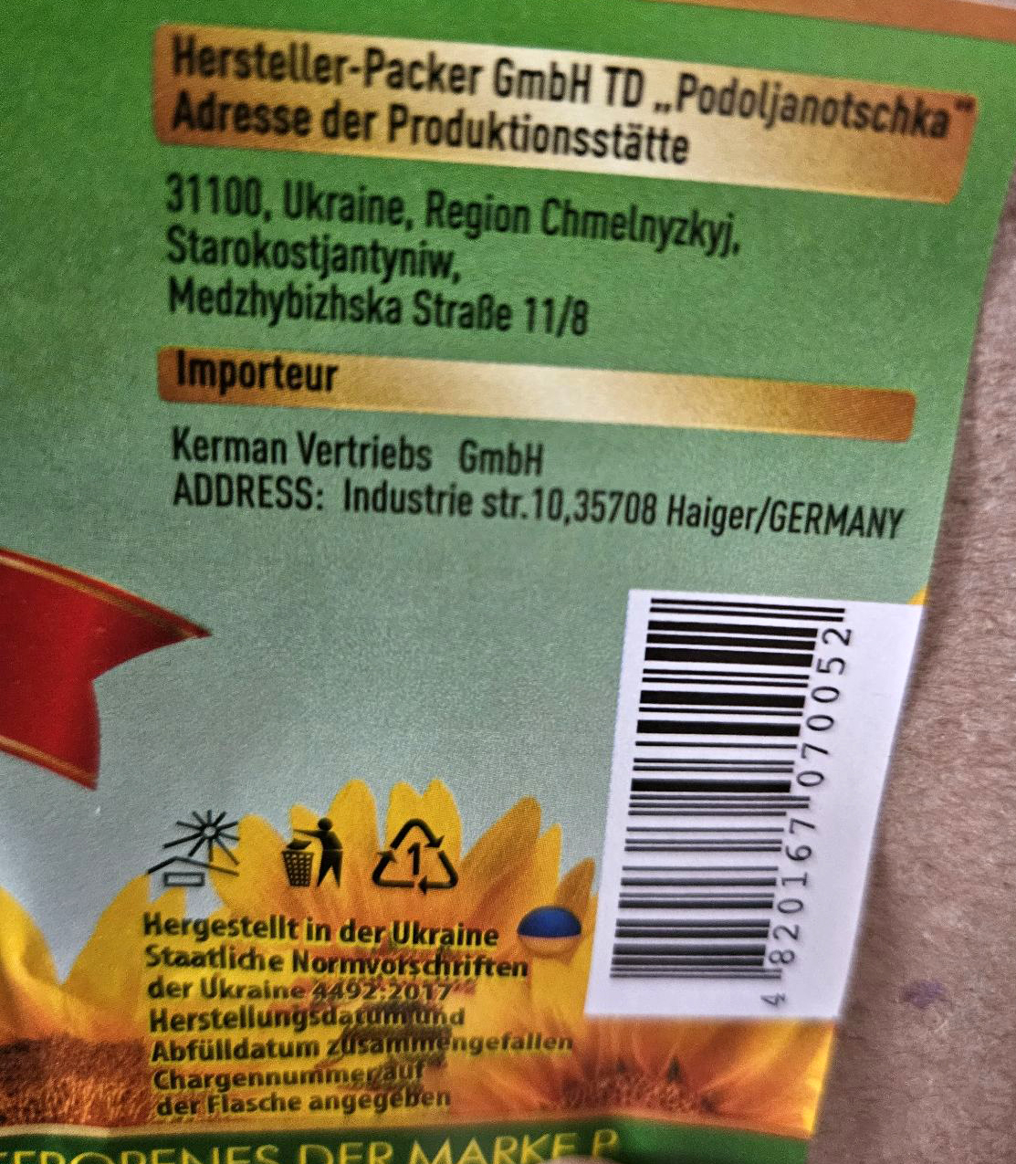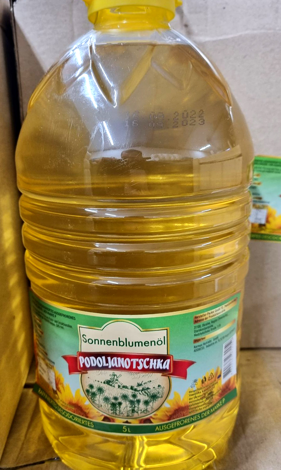 Vysoce kvalitní univerzální slunečnicový olej značky Podoljanotschka určený pro německý trh.